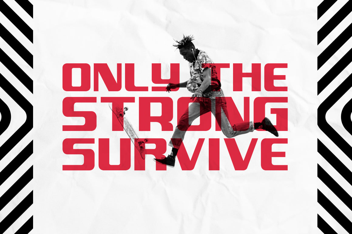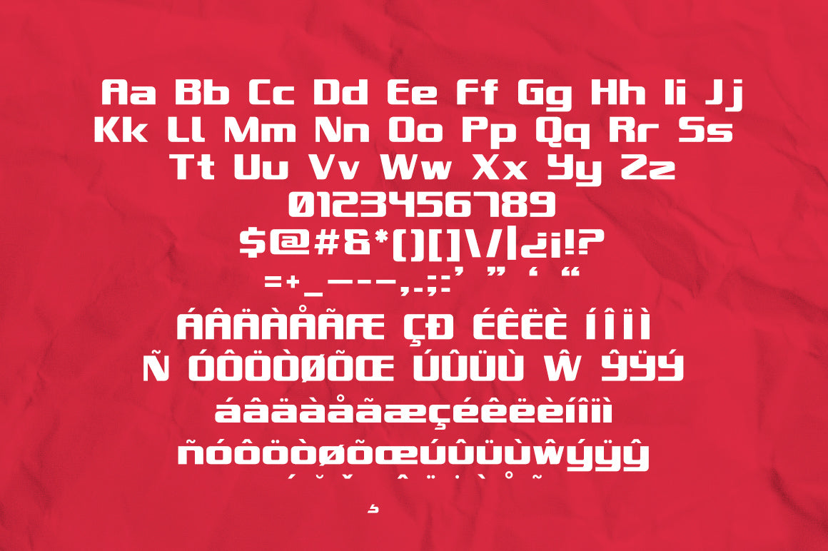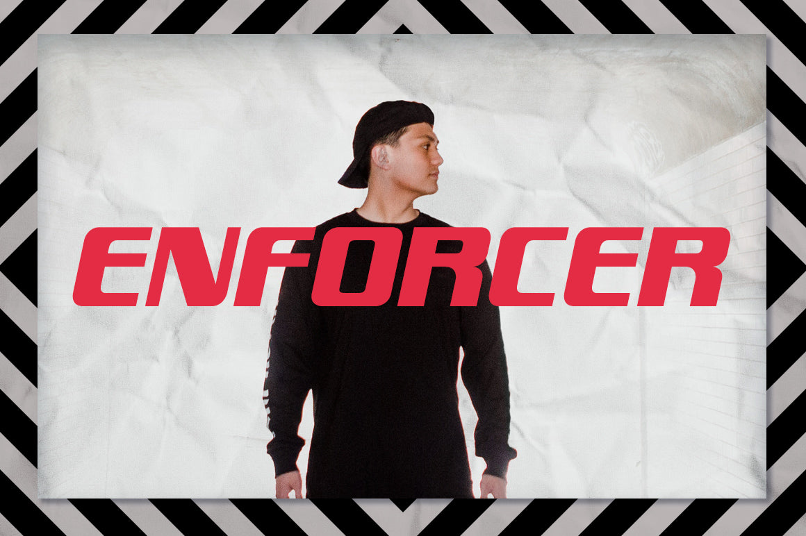 Think power and "top of the table" position when using this font. ENFORCER will work great for sports apparel, jerseys, and even branding, when you want a slant on Serpentine or some other overused signage typeface. Use the alternate glyphs to create different combos and set different moods whether in a retail space or promoting your sports team.