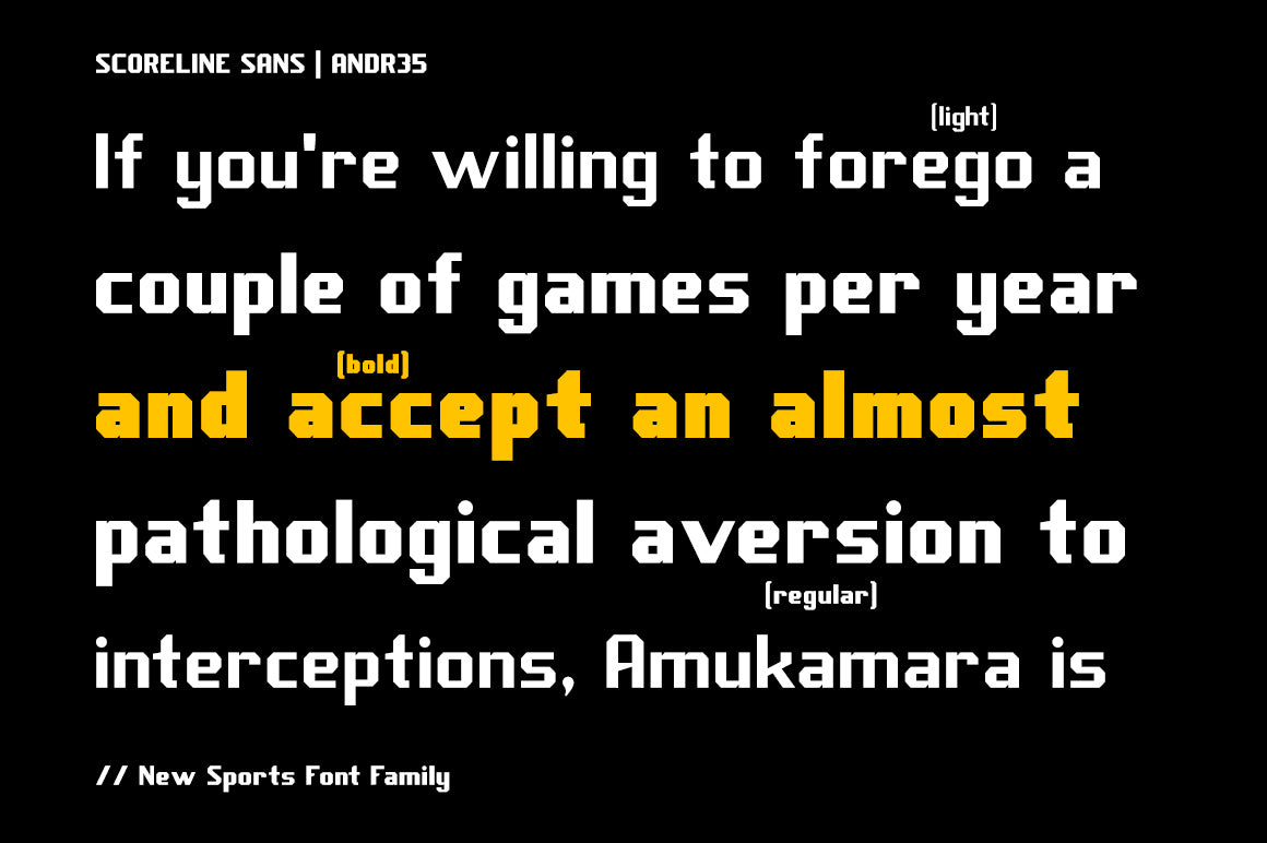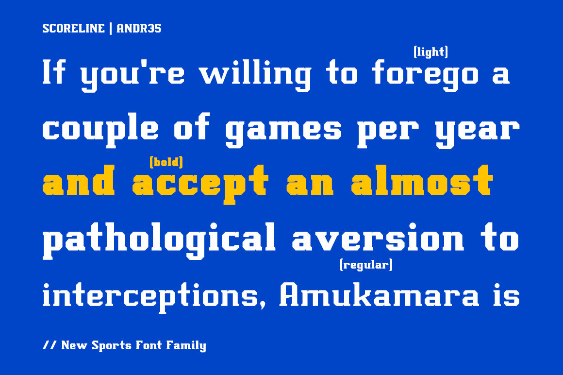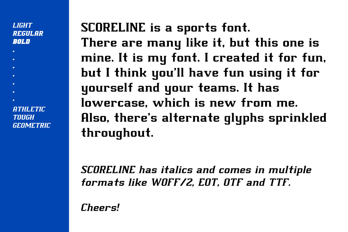 - Scoreline Sans: 3 weights, 3 Italics